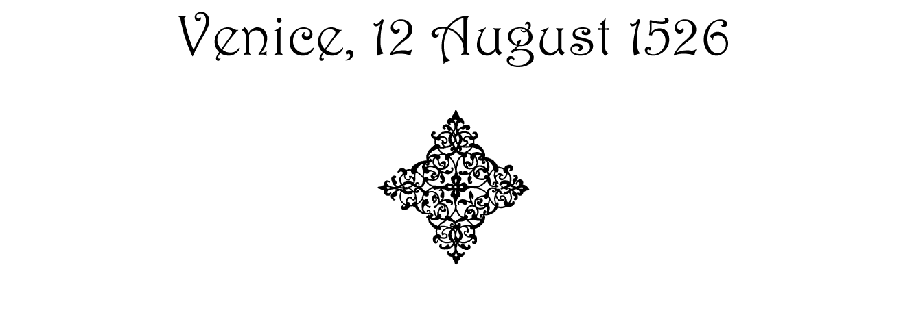 I paused at the highest point of the bridge and glanced at him in irritation. We had just come from the Fontego dei Tedeschi, the Exchange House of the Germans, a vast building of white stone with jagged crenellations like some Saracen fortress that rose five storeys high out of the water of the Grand Canal. Here, in the office of the agent of Anton Fugger, banker to emperors and popes, I had presented my mother’s bill and asked for a quarter of my sum in gold, and the rest in smaller bills of exchange. The agent unlocked one of the chests that stood against the wall and lifted out a large canvas bag. From this he scooped out gold, and gold, and more gold. It thrilled me to see those shimmering stacks of ducats, which the clerk marshalled into ranks, counted and then counted again: thirty stacks and more, of twenty ducats apiece, like the towers of a golden city. Seven hundred and seventeen coins in all, stamped on one side with Saint Mark and the Doge, and Christ seated in His glory on the other. I had the coins gathered into a leather purse, which I fastened to my belt beside my dagger. It was a fair burden: nearly four pounds’ weight of gold.