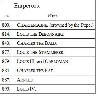 The monks, indeed, seem to have been the most refractory of subjects, perhaps because they were already exempted from the ordinary punishments. In order to produce uniformity in the services and chants of the Church, the emperor sent to Rome for twelve monkish musicians, and distributed them in the twelve principal bishoprics of his dominions. The twelve musicians would not consent to be musical according to order, and made the confusion greater than ever, for each of them taught different tunes and a different method. The disappointed emperor could only complain to the Pope, and the Pope put the recusant psalmodists in prison. But it appears the fate of Charlemagne, as of all persons in advance of their age, to be worthy of congratulation only for his attempts. The success of many of his undertakings was not adequate to the pains bestowed upon them. He held many assemblages, both lay and ecclesiastical, during his lengthened reign; he published many excellent laws, which soon fell into disuse; he tried many reforms of churches and monasteries, which shared the same fortune; he held the Popes of Rome and the dignitaries of his empire in perfect submission, but professed so much respect for the office of Pontiff and Bishop, that, when his own overwhelming superiority was withdrawn, the Church rebelled against the State, and claimed dominion over it. His sense of justice, as well as the custom of the time, led him to divide his states among his sons, which not only insured enmity between them, but enfeebled the whole of Christendom. Clouds, indeed, began to gather over him some time before his reign was ended. One day he was at a city of Narbonese Gaul, looking out upon the Mediterranean Sea. He saw some vessels appear before the port. “These,” said the courtiers, “must be ships from the coast of Africa, Jewish merchantmen, or British traders.” But Charlemagne, who had leaned a long time against the wall of the room in a passion of tears, said, “No! these are not the ships of commerce; I know by their lightness of movement. They are the galleys of the Norsemen; and, though I know such miserable pirates can do me no harm, I cannot help weeping when I think of the miseries they will inflict on my descendants and the lands they shall rule.” A true speech, and just occasion for grief, for the descents of these Scandinavian rovers are the great characteristic of this century, by which a new power was introduced into Europe, and great changes took place in the career of France and England.