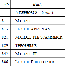 The curious thing is, that this longing for a restoration of the Roman Empire, and dwelling on its usefulness and grandeur, were dominant, and productive of great events, in populations which had no drop of Roman blood in their veins. The last emperor resident in Rome had never heard the names of the hordes of savages whose descendants had now seized the plains of France and Italy. Yet it seemed as if, with the territory of the Roman Empire, they had inherited its traditions and hopes. They might be Saxons, or Franks, or Burgundians, or Lombards, by national descent, but by residence they were Romans as compared with the Greeks in the East,—and by religion they were Romans as compared with the Sclaves and Saracens, who pressed on them on the North and South. It would not be difficult in this country to find the grandchildren of French refugees boasting with patriotic pride of the English triumphs at Cressy and Agincourt—or the sons of Scottish parents rejoicing in their ancestors’ victory under Cromwell at Dunbar; and here, in the eighth century, the descendants of Alaric and Clovis were patriotically loyal to the memory of the old Empire, and were reminded by the victories of Charlemagne of the trophies of Scipio and Marius. These victories, indeed, were not, as is so often found to be the case, the mere efforts of genius and ambition, with no higher object than to augment the conqueror’s power or reputation. They were systematically pursued with a view to an end. In one advancing tide, all things tended to the Imperial throne. Whatever nation felt the force of Charlemagne’s sword felt also a portion of its humiliation lightened when its submission was perceived to be only an advancement towards the restoration of the old dominion. It might have been degrading to acknowledge the superiority of the son of Pepin—but who could offer resistance to the successor of Augustus? So, after thirty years of uninterrupted war, with campaigns succeeding each in the most distant regions, and all crowned with conquest; after subduing the Saxons beyond the Weser, the Lombards as far as Treviso, the Arabs under the walls of Saragossa, the Bavarians in the neighbourhood of Augsburg, the Sclaves on the Elbe and Oder, the Huns and Avars on the Raab and Danube, and the Greeks themselves on the coast of Dalmatia; when he looked around and saw no rebellion against his authority, but throughout the greater part of his domains a willing submission to the centralizing power which rallied all Christian states for the defence of Christianity, and all civilized nations for the defence of civilization,—nothing more was required than the mere expression in definite words of the great thing that had already taken place, and Charlemagne, at the extreme end of this century, bent before the successor of St. Peter at Rome, and stood up crowned Emperor of the West, and champion and chief of Christendom.