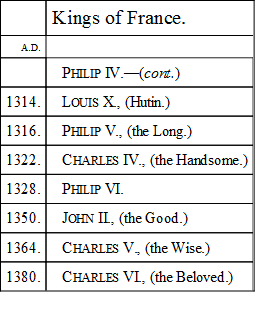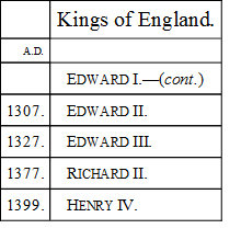 Edward’s sister had been the wife of Alexander the Third of Scotland. Two sons of that marriage had died, and the only other child, a daughter, had married Eric the Norwegian. In Margaret, the daughter of this king, the Scottish succession lay, and when her grandfather died in 1290, the Scottish states sent a squadron to bring the young queen home, and great preparations were made for the reception of the “Maid of Norway.” But the Maid of Norway was weak in health; the voyage was tempestuous and long; and weary and exhausted she landed on one of the Orkney Islands, and in a short time a rumour went round the land that the hope of Scotland was dead. Edward was among the first to learn the melancholy news. He determined to assert his rights, and began by trying to extend the feudal homage which several of the Scottish kings had rendered for lands held in England, over the Scottish crown itself. When the various competitors for the vacant throne submitted their pretensions to his decision he made their acknowledgment of his supremacy an indispensable condition. Out of the three chief candidates he fixed on John Baliol, who, in addition to the most legal title, had perhaps the equal recommendation of being the feeblest personal character. Robert Bruce and Hastings, the other candidates, submitted to their disappointment, and Baliol became the mere viceroy of the English king. He obeyed a summons to Westminster as a vassal of Edward, to answer for his conduct, and was treated with disdain. |A.D. 1293.|But the Scottish barons had more spirit than their king. They forced him to resist the pretensions of his overbearing patron, and for the first time, in 1295, began the long connection between France and Scotland by a treaty concluded between the French monarch and the twelve Guardians of Scotland, to whom Baliol had delegated his authority before retiring forever to more peaceful scenes. From this time we find that, whenever war was declared by France on England, Scotland was let loose on it to distract its attention, in the same way as, whenever war was declared upon France, the hostility of Flanders was roused against its neighbour. But the benefits bestowed by England on her Low Country ally were far greater than any advantage which France could offer to Scotland. Facilities of trade and favourable tariffs bound the men of Ghent and Bruges to the interests of Edward. But the friendship of France was limited to a few bribes and the loan of a few soldiers. Scotland, therefore, became impoverished by her alliance, while Flanders grew fat on the liberality of her powerful friend. England itself derived no small benefit both from the hostility of Scotland and the alliance of the Flemings. When the Northern army was strong, and the King was hard pressed by the great Wallace, the sagacious Parliament exacted concessions and immunities from its imperious lord before it came liberally to his aid; and whenever we read in one page of a check to the arms of Edward, we read in the next of an enlargement of the popular rights. When the first glow of the apparent conquest of Scotland was past, and the nation was seen rising under the Knight of Elderslie after it had been deserted by its natural leaders, the lords and barons,—and, later, when in 1297 he gained a great victory over the English at Stirling,—the English Parliament lost no time in availing themselves of the defeat, and sent over to the king, who was at the moment in Flanders menacing the flanks of France, a parchment for his signature, containing the most ample ratification of their power of granting or withholding the supplies. It was on the 10th of October, 1297, that this important document was signed; and, satisfied with this assurance of their privileges, the “nobles, knights of the shire, and burgesses of England in parliament assembled” voted the necessary funds to enable their sovereign lord to punish his rebels in Scotland. Perhaps these contests between the sister countries deepened the patriotic feeling of each, and prepared them, at a later day, to throw their separate and even hostile triumphs into the united stock, so that, as Charles Knight says in his admirable “Popular History,” “the Englishman who now reads of the deeds of Wallace and Bruce, or hears the stirring words of one of the noblest lyrics of any tongue, feels that the call to ‘lay the proud usurper low’ is one which stirs his blood as much as that of the born Scotsman; for the small distinctions of locality have vanished, and the great universal sympathies for the brave and the oppressed stay not to ask whether the battle for freedom was fought on the banks of the Thames or of the Forth. The mightiest schemes of despotism speedily perish. The union of nations is accomplished only by a slow but secure establishment of mutual interests and equal rights.”