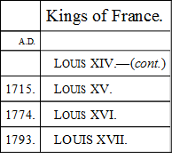 When the war had lasted eight or nine years, the reputation of Marlborough and the British arms was at its height. Our fleets were masters of the sea, and the Grand Monarque sent humble petitions to the opposing powers for peace upon any terms. People tell us that Marlborough rejected all overtures which might have deprived him of the immense emoluments he received for carrying on the war. |A.D. 1711.|Perhaps, also, he was inspired by the love of fame; but, whether meanness or ambition was his motive, his warlike propensities were finally overcome,—for his wife, the imperious duchess, quarrelled with Queen Anne,—the ministry was changed, and the jealousies of Whitehall interfered with the campaigns in Flanders. |A.D. 1713.|Marlborough was displaced, and a peace patched up, which, under the name of the Peace of Utrecht, is quoted as showing what small fruits British diplomacy sometimes derives from British valour. Louis the Fourteenth, conquered at all points, his kingdom exhausted, and all his reputation gone, saw his grandson in possession of the crown which had been the original cause of the war, and Great Britain rewarded for all her struggles by the empty glory of filling up the harbour of Dunkirk, and the scarcely more substantial advantage, as many considered it at the time, of retaining Gibraltar, a barren rock, and Minorca, a useless island. After this, we find a long period of inaction on the continent produce its usual effect. When thirty years had passed without the foreign populations having sight of the British grenadiers, they either forgot their existence altogether, or had persuaded themselves that the new generation had greatly deteriorated from the old.A.D. 1743. A.D. 1745. It needed the victory of Dettingen, and the more glorious repulse of Fontenoy, to recall the soldiers of Oudenarde and Malplaquet.