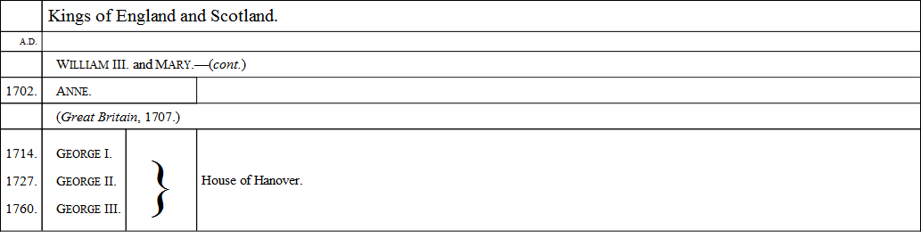 But the memory of his ancestors was too recent. Men of middle age remembered James the Second in his tyrannical supremacy at Holyrood. The time was not sufficiently remote for romance to have gathered round the harsh reality and hidden its repulsive outlines. A few months showed the Pretender the hopelessness of his attempt; and the tranquillity of the country was considered to be re-established when the adherents of the losing cause were visited with the harshest penalties. The real result of these vindictive punishments was, that they added the spirit of revenge for private wrong to the spirit of loyalty to the banished line. Many circumstances concurred to favour the defeated candidate, who seemed to require to do nothing but bide his time. The throne was no longer held, even under legalized usurpation, as the discontented expressed it, by one of the ancient blood. |A.D. 1714.|A foreigner, old and stupid, had come over from Hanover and claimed the Parliamentary crown, and the few remaining links of attachment which kept the high-prerogative men and the Roman Catholics inactive in the reign of Queen Anne, the daughter of their rightful king, lost all their power over them on the advent of George the First, who had to trace up through mother and grandmother till he struck into the royal pedigree in the reign of James the First. It was thought hard that descent from that champion of monarchic authority and hereditary right should be pleaded as a title to a crown dependent on the popular choice. As years passed on, the number of the discontented was of course increased. Whoever considered himself neglected by the intrusive government turned instinctively to the rival house. A courtier offended by the brutal manners of the Hanoverian rulers looked longingly across the sea to the descendant of his lineal kings. The foreign predilections, and still more foreign English, of the coarse-minded Georges, made them unpopular with the weak or inconsiderate, who did not see that a very inelegant pronunciation might be united with a true regard for the interests of their country.
