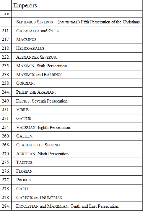 ANARCHY AND CONFUSION – GROWTH OF THE CHRISTIAN CHURCHWe are now in the twelfth year of the Third Century. Septimius Severus has died at York, and Caracalla is let loose like a famished tiger upon Rome. He invites his brother Geta to meet him to settle some family feud in the apartment of their mother, and stabs him in her arms. The rest of his reign is worthy of this beginning, and it would be fatiguing and perplexing to the memory to record his other acts. Fortunately it is not required; nor is it necessary to follow minutely the course of his successors. What we require is only a general view of the proceedings of this century, and that can be gained without wading through all the blood and horrors with which the throne of the world is surrounded. Conclusive evidence was obtained in this century that the organization of Roman government was defective in securing the first necessities of civilized life. When we talk of civilization, we are too apt to limit the meaning of the word to its mere embellishments, such as arts and sciences; but the true distinction between it and barbarism is, that the one presents a state of society under the protection of just and well-administered law, and the other is left to the chance government of brute force. There was now great wealth in Rome—great luxury—a high admiration of painting, poetry, and sculpture—much learning, and probably infinite refinement of manners and address. But it was not a civilized state. Life was of no value—property was not secure. A series of madmen seized supreme authority, and overthrew all the distinctions between right and wrong. Murder was legalized, and rapine openly encouraged. It is a sort of satisfaction to perceive that few of those atrocious malefactors escaped altogether the punishment of their crimes. If Caracalla slays his brother and orders a peaceable province to be destroyed, there is a Macrinus at hand to put the monster to death. |A.D. 218.|But Macrinus, relying on the goodness of his intentions, neglects the soldiery, and is supplanted by a boy of seventeen—so handsome that he won the admiration of the rudest of the legionaries, and so gentle and captivating in his manners that he strengthened the effect his beauty had produced. He was priest of the Temple of the Sun at Emesa in Phœnicia; and by the arts of his grandmother, who was sister to one of the former empresses, and the report that she cunningly spread abroad that he was the son of their favourite Caracalla, the affection of the dissolute soldiery knew no bounds. Macrinus was soon slaughtered, and the long-haired priest of Baal seated on the throne of the Cæsars, under the name of Heliogabalus. As might be expected, the sudden alteration in his fortunes was fatal to his character. All the excesses of his predecessors were surpassed. His extravagance rapidly exhausted the resources of the empire. His floors were spread with gold-dust. His dresses, jewels, and golden ornaments were never worn twice, but went to his slaves and parasites. He created his grandmother a member of the Senate, with rank next after the consuls; and established a rival Senate, composed of ladies, presided over by his mother. Their jurisdiction was not very hurtful to the State, for it only extended to dresses and precedence of ranks, and the etiquette to be observed in visiting each other. But the evil dispositions of the emperor were shown in other ways. He had a cousin of the name of Alexander, and entertained an unbounded jealousy of his popularity with the soldiers. Attempts at poison and direct assassination were resorted to in vain. The public sympathy began to rise in his favour. The Prætorians formally took him under their protection; and when Heliogabalus, reckless of their menaces, again attempted the life of Alexander, the troops revolted, proclaimed death to the infatuated emperor, and slew him and his mother at the same time.