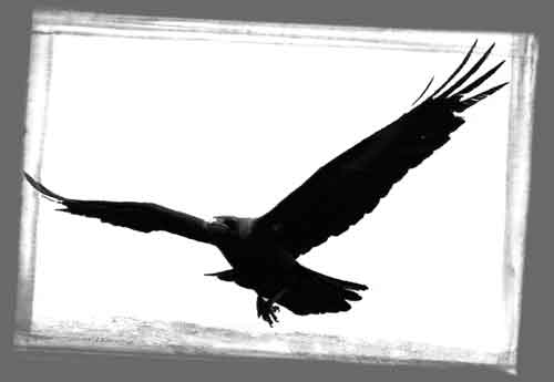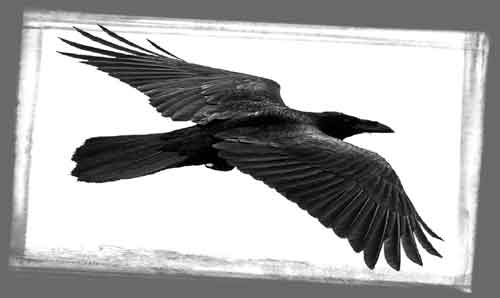 Langsam dreht er sich zum Weißdorn-Gebüsch um und traut seinen Augen nicht. Der Kolkrabe kommt aus dem Schutz des Gebüschs hervor und befindet sich nun ganz in seiner Nähe. Der Junge geht in die Hocke. Ihre Blicke begegnen sich. Plötzlich hört er eine knarzige Stimme: