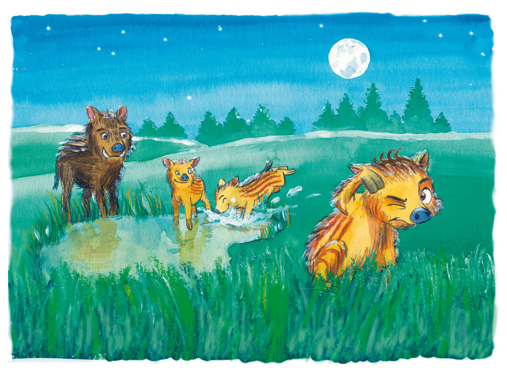 Sie werden Frischlinge genannt und haben witzige Streifen auf ihren Rücken. Das kleine Wildschwein Max schaut seinen Geschwistern zu.