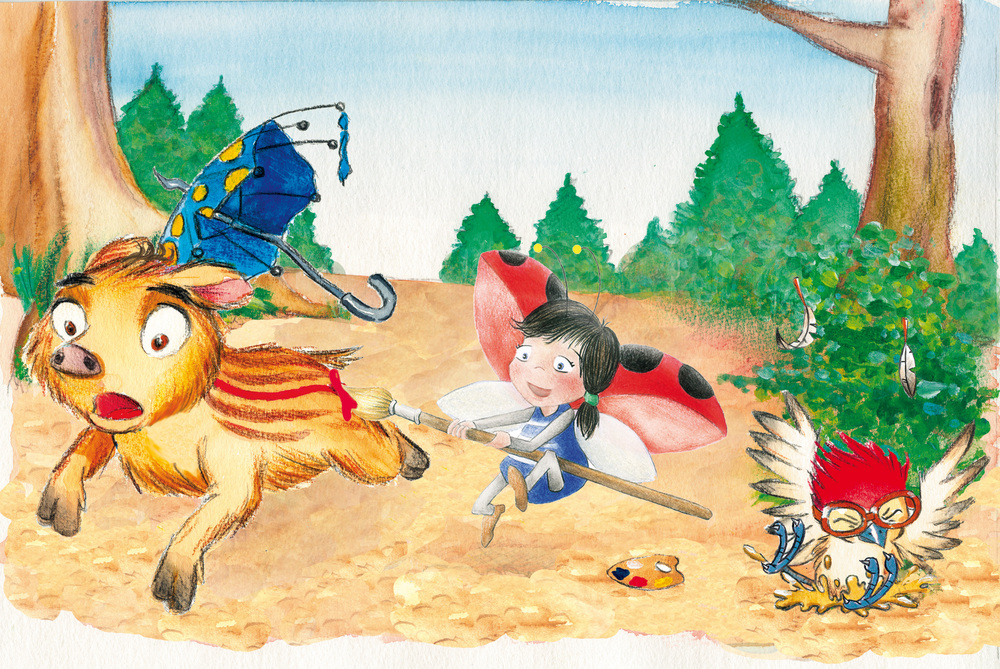 „Na klar, Max“, antwortet Marie. Max schaut Marie misstrauisch zu, wie sie ihren ersten Punkt malt. Da landet mit einem Knall der Buntspecht Harry bei seiner Flugübung direkt neben Max! Dreck spritzt hoch. Max erschrickt und rennt los. Marie rutscht der Pinsel aus. Und aus dem roten Punkt wird ein langer roter Strich. Buntspecht Harry ruft Max hinterher: