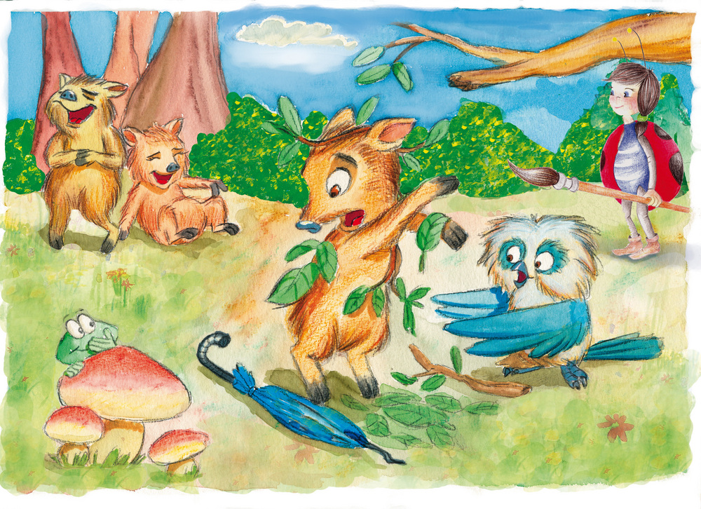 Max versucht die Blätter abzuschütteln. Die Geschwister sehen alles und halten sich den Bauch vor Lachen. Marienkäfer Marie wacht auf: