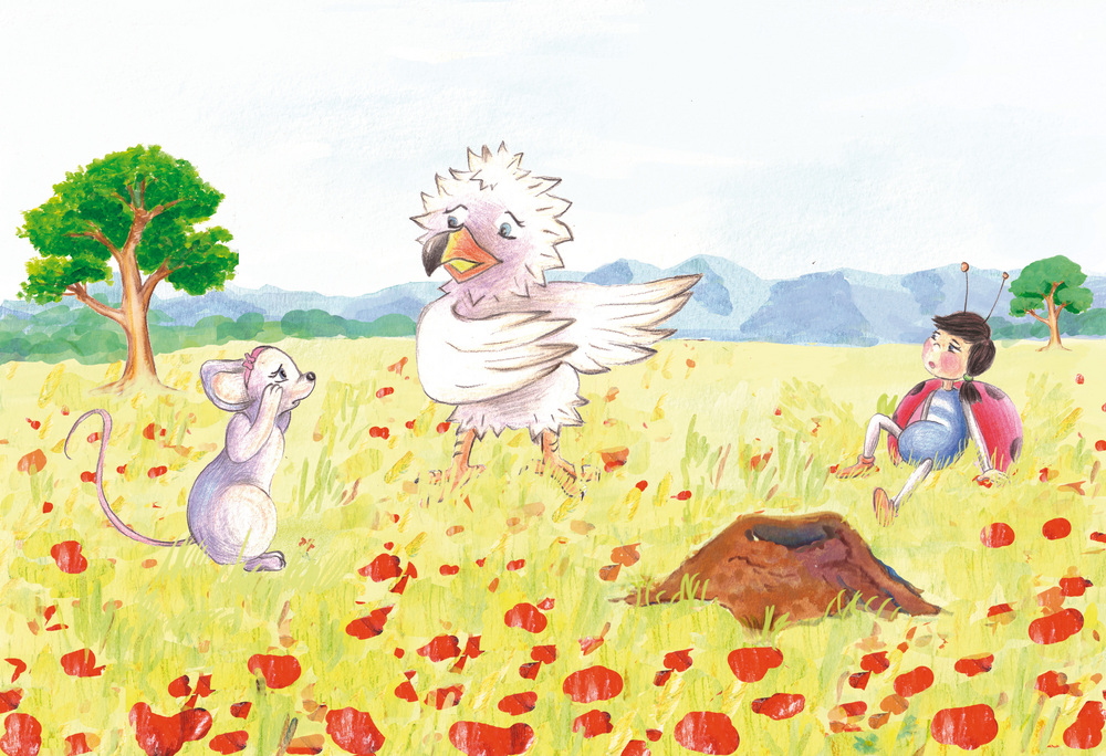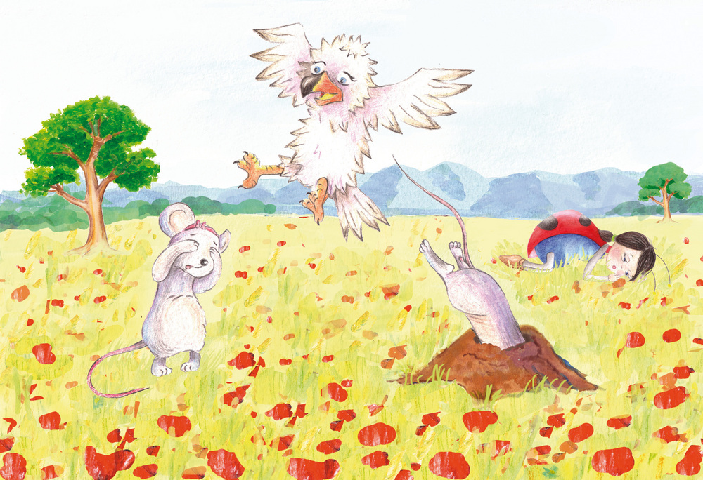 Da entdeckt Horst zwei Mäuse! Sofort flattert er im Sturzflug darauf zu. Zur Landung fährt er die Flügel und Klauen aus. Kurz vor der Landung sieht er noch, wie eine Maus vor Schreck die Pfoten über ihr Gesicht hält. Die andere Maus flüchtet in ein Mauseloch. Und was liegt da noch?