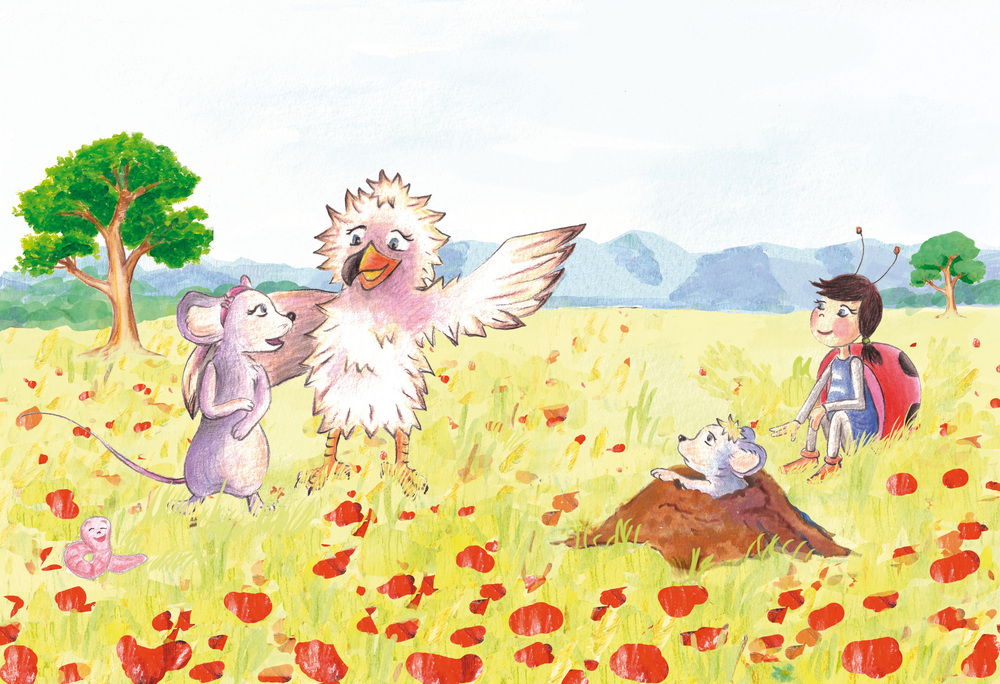 Line hat einen kleinen Freund der heißt Matze. Matze guckt jetzt aus dem Mauseloch und ruft Line hinterher: „Line, du kannst doch nicht mit einem Bussard spazierengehen!“