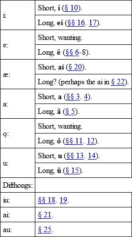 § 28. In the preceding paragrafs the Gothic vowels hav been givn according to the letters by which they ar represented. Now they wil be arranged according to the nature of their sounds, the following scale of seven vowels from i to u being taken as a basis: