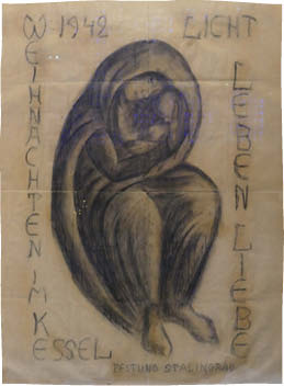 Kurt Reuber beginnt zu improvisieren. Als Papier nimmt er eine Landkarte von Russland, als Stift ein Stück Kohle. Damit beginnt er zu zeichnen, zeichnet ein unendlich zartes, ein geschlossenes Bild, zeichnet nichts anderes als Maria mit dem Kind. Maria hat sich hingesetzt, hält in ihren Armen ihr neugeborenes Kind, hält es eng, hält es warm. Die Gesichter sind einander zugewandt. Um sich und das Kind hat Maria einen Mantel geschlungen, einen Schutzmantel. Ein Bild des Friedens und der Innigkeit. So dünn der Stoff des Mantels auch sein mag, so schützt er doch, hält alles ab, was droht und ängstigt: die Nacht, den Schrecken, den Hass, den Tod. Innerhalb dieses Mantels gibt es nur drei Dinge: Licht, Leben und Liebe. Das ist Weihnachten, das ist die Weihnachtsbotschaft. Kurt Reuber schreibt die Worte neben die Zeichnung: Licht, Leben, Liebe. Dann stellt er das Bild auf und feiert mit den anderen die Heilige Nacht. Für seine Frau notiert er über dem Bild: »Schau in dem Kind das Erstgeborene einer neuen Menschheit an, das unter Schmerzen geboren, alle Dunkelheit und Traurigkeit überstrahlt.«