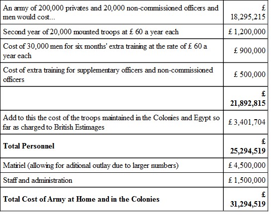 It will probably be admitted that an army raised and trained on the plan here set forth would be far superior in war to the heterogeneous body which figures in the Army Estimates at a total strength of 540,000 regulars, militia, and volunteers. Its cost would in no case be more than that of the existing forces, and would probably be considerably less. This is the point which requires to be proved.