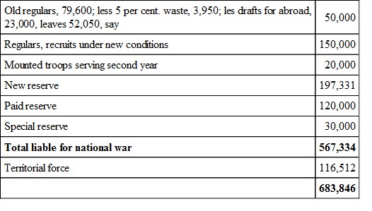 In these tables I have taken the drafts for India and the Colonies from the old regulars. But they can just as well be taken from the new regulars. If need be the old regulars could, before the fourth year, be passed into the paid reserve, and the full contingent of 200,000 one year's men taken.