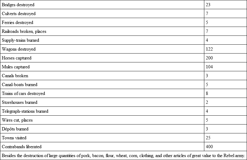 In our travels we have captured and paroled over three hundred prisoners, burned five or six railroad bridges, destroyed all the ferries on our route, captured and demolished two wagon-trains, burned five or six dépôts of stores, destroyed one railroad train, besides stations and telegraph offices, and have torn several miles of track. We have taken over one hundred and fifty horses, some of them the finest in the country.