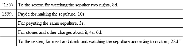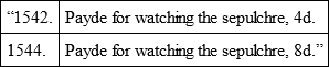 In this case, of course, the sepulchre was merely a temporary erection. In the churchwardens’ accounts of Waltham Abbey Church are the following entries: