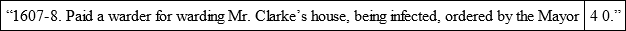 In many towns, great wisdom was displayed by erecting huts on breezy moors and other places away from the busy haunts of men, for the reception of the plague-stricken persons, and to which they were removed. The inmates of a house were not suffered to leave the homes from whence the patients had been removed. An order passed in London, in 1570, states: “Howses, having some sicke, though none die, or from whence some sicke have been removed, are infected houses, and such are to be shutt upp for a moneth. The whole family to tarrie xxviii daies.” Round the houses, watch and ward were constantly kept to prevent egress. Certain boundaries were defined, and these could not be passed. The watchers provided the inmates of the houses with food, etc., and took messages to their friends. In the churchwardens’ accounts of St. Mary, Woolchurch, Haw, is an entry: —