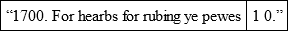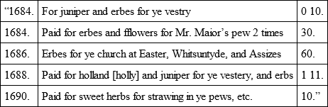 In courts of justice, might be seen large nosegays, not for ornament, but as preservatives against the pest. The Rev. J. R. Boyle, F.S.A., has gone carefully over the churchwardens’ accounts of St. Nicholas’, now the Cathedral of the city of Newcastle, and reproduced some curious items in his guide to the building. Here follow a few of the items: