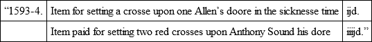 On the door of the infected house was the sign of a cross, in a flaming red colour, with the pathetic prayer, “Lord, have mercy on us.” In old churchwardens’ accounts, many items like the following, drawn from the accounts of St. Mary, Woolnoth, London, might be quoted: