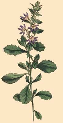 The oldest plant in our possession is about a foot and a half high, much branched, the stalks are round and smooth to the naked eye, green below, above purplish, the leaves are smooth, a deep bright green colour, alternate, standing on footstalks, which gradually widen into the leaves, somewhat ovate, and deeply toothed; the flowers grow in the alæ of the leaves, forming a thin spike, they are sessile, of a pale violet colour, and have a peculiar smell which is rather unpleasant; at the side of each flower are two long narrow Bracteæ; the Calyx, which is placed on the germen, is composed of five short ovate leaves, which appear edged with hairs if magnified; the Corolla is monopetalous, the lower part, which at first is tubular, splits longitudinally above, and forms a kind of half tube, the edges of which are brown, the inside yellow, the outside greenish, the mouth beset with short hairs, each of which is terminated by a small villous head; the limb is deeply divided into five linear segments, spreading out like a hand, and terminated by short points; the Filaments are five in number, of a whitish colour, somewhat broadest above, rather flat, inserted into the receptacle; Antheræ oval, flattened, yellow, bilocular, a little bent, the length of the pistillum; but this is to be understood of such flowers as are not yet fully expanded, in those that are, they are much shorter, and appear withered; the Style, in flowers about to open, the length of the filaments, upright, in those that are opened much longer, and bent somewhat downward; Stigma at first upright, in the form of a cup, having the edge curiously fringed with white hairs, afterwards it closes together, loses its hollow, and assumes a flat appearance, and nods somewhat, the back part of it is bearded; Germen beneath the calyx, oblong, usually abortive with us.
