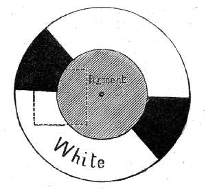We will now proceed to demonstrate how we can measure the amount of spectral light reflected by different pigments. Let us take a strip of card painted with a paste of vermilion, leaving half the breadth white; and similarly one with emerald green. If we place the first in the spectrum so that half its breadth falls on the red, and the other half on the white card, we shall see that apparently the red and orange rays are undiminished in intensity by reflection from the vermilion, but that in the green and beyond but very little of the spectrum is reflected. With the emerald green placed similarly in the spectrum, the red rays will be found to be absorbed, but in the green rays the full intensity of colour is found, fading off in the blue. What we now have to do is to find a method of comparing the intensities of the different rays reflected from the pigments, with those from the white surface. We will commence with the second of the two methods which the writer devised with this object, and then describe the first, which is more complex. Suppose we have, say a card disc three inches in diameter, painted with the pigment whose reflective power has to be measured, and place it on a rotating apparatus with black and white sectors of say five inches diameter, and capable of overlapping so as to show different proportions of black to white (see Fig. 42). If we throw a colour patch (shown in Fig. 14 as the area inside the dotted square) on the combination of black and white, and at the same time on the pigmented disc, it is probable that either one or other will be the brighter. By moving the slit along the spectrum it is evident, however, that a colour can be found which is equally reflected from them both whilst rotating. Take as an example the sectors as set at two parts white, to one part black, the centre disc being vermilion, the slit is moved along the spectrum until such a point is reached that the colour reflected from the ring and the disc appears of the same brightness, for it must be recollected that they cannot differ in hue, as the light is monochromatic. It will be found that the place where they match in brightness is in the red, the exact position being fixed by the scale at the back of the slide. Taking the proportion of black to white as three to one, the match will be found to take place in the orange. Increasing the proportion of black more and more, a point will be reached where the reflection takes place uniformly along the blue end of the spectrum, this will be from the green to the end of the violet. By sufficiently increasing the number of matches made, a curve of reflection can be made showing the exact proportion of each ray of the spectrum that is reflected. The uniform reflection along the blue end of the spectrum shows that a certain amount of white light is reflected from the pigment.