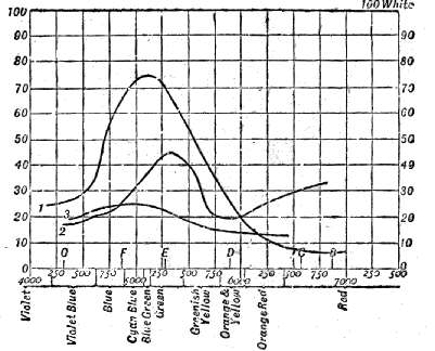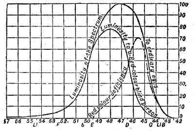 It must be remembered that we have so far dealt with colours which are spectrum colours, and which are intense because they are colours produced by the spectrum of an intensely bright source of light. By an artifice we can deduce from this curve the luminosity curve of the spectrum of any other source of light. If by any means we can compare, inter se, the intensity of the same rays in two different sources of light, one being the electric light, we can evidently from the above figure deduce the luminosity curve of the spectrum of the other source of light (see p. 109).