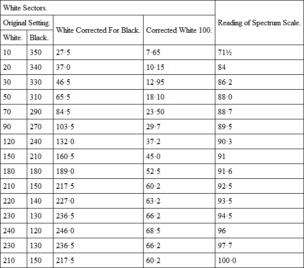 Next taking the emerald green disc, if we adopt the same procedure it will be found that for some shades of the ring there are two places in the spectrum from which the colours reflected give the same brightness. By plotting curves in exactly the same way as that shown for the curve of luminosity at page 78, substituting for the open aperture of the sector the angular value of the white used, we can show graphically the correct reflection for each part of the spectrum. Sometimes three places in the spectrum will be read, as giving equal reflections from the coloured disc and the grey ring.