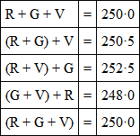 The mean of the first four is 250·25, which is only 1/10 % different from the value of 250 obtained from the measurement of (R + G + V) combined. Other measures fully bore out the fact that the luminosity of the mixed light is equal to the sum of the luminosities of its components. It is true that we have here only been dealing with spectrum colours, but we shall see when we come to deal with the mixture of colours reflected from pigments that the same law is universally true.