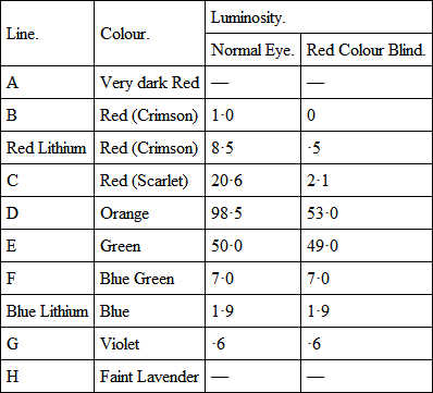 The failure of the red colour-blind person to perceive red is very well shown from this table. It will for instance be noticed that he perceives about one-tenth of the light at C which the normal-eyed person perceives.
