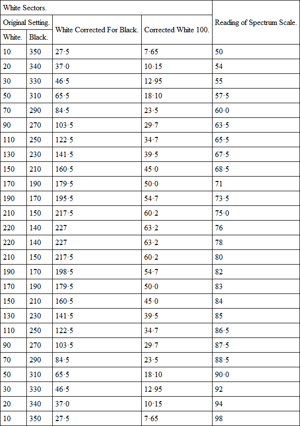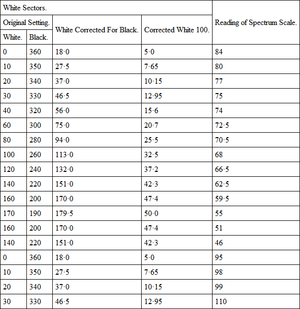 A modification of this plan can be employed for measuring the luminosity of the spectrum, and it is excessively useful, because we can adapt it to the measurement of colours other than these simple ones. In the plan already explained it was the colour in the patch that was altered, to get an equal luminosity with a certain luminosity of white light. In the modified plan the luminosity of the white light is altered, for the luminosity of the shadow illuminated by the reflected beam can be altered rapidly at will by opening or closing the apertures of the sectors whilst it is rotating. The slit in the slide is placed in the spectrum at any desired point, and the aperture of the sectors altered till equal luminosities are secured. The readings by this plan are very accurate, and give the same results as obtained by the previous method employed.
