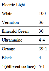 The scale is that of the prismatic spectrum employed. On page 46 we stated that a white surface could be made to appear darker than a black surface, by illuminating the latter and cutting off the light from the former. By placing the black surface in place of one of the coloured ones, as shown in page 82, the luminosity of the black surface can be ascertained. In this case it was found that almost exactly 5 % of the white light from the crater of the positive pole was reflected.In the table the original measures are shown, and also the corrected measures, and for convenience sake the intensity of every ray throughout the length of the spectrum reflected from white, has been taken as 100. The position of the reference lines on the scale (Fig. 15) are as follows —