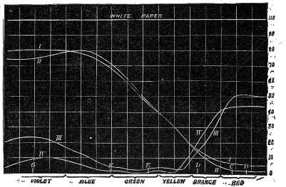It has been stated in chapter V., that it is generally immaterial whether a pigment is in contact with the paper or away from it, so long as the light passes through the pigment. The above figure (Fig. 26) shows the truth of this assertion. I. and II. are the curves taken of the light transmitted by Prussian blue and carmine respectively, and III. and IV., from the light reflected from these colours on paper.