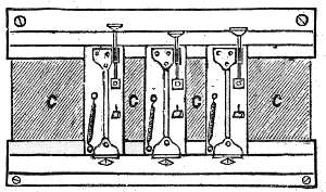 It will be seen that the three slits can be closed or opened from the centre by a parallel motion. They also slide in a couple of grooves, so that they can be moved along the frame into any position. The position they occupy is indicated by a scale engraved on the front of the slide. Behind the grooves in which the slits move are another pair of grooves, into which small pieces of card CCCC can slide, and thus close the apertures between the slits. By this arrangement all rays except those coming through the slits themselves are cut off. The metal frame fits on to an outer wooden frame, which slides in the grooves used with the card in the apparatus as already described. It is convenient always to keep the scale on the back of this wooden slide in the same position as regards the shadow of the needle-point used for registering the position, and to move the slits along their grooves when a change in position is required. Using these three slits three different colours can be thrown on the same square patch on the screen.
