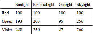 The method of mixing three colours together gives us a means of imitating all kinds of white light, as it does of coloured light. At page 110 we have already given a diagram of the relative amounts of spectrum colours in sunlight, skylight and gaslight. If we by any means throw a patch of the light which we wish to match on the patch formed by the colour patch apparatus, and interpose the rod, we can measure the apertures of the three slits, and thus arrive at the relative proportions of each colour present. In an experiment carried out, sunlight, the electric arc-light, and gaslight were compared in this manner. The following are the results, the red being near the C line, the green near the E line, and the violet near the G line of the solar spectrum.