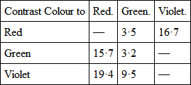 Thus to form the contrast to red took 13·5 of red, 11·8 of green, and 22·5 of violet. Now from each of these there can be deducted the amount of white light, which will leave only two colours mixed. Calculating this out we find that the contrasts are —
