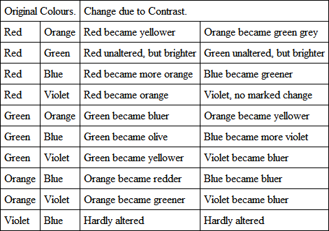The contrasts here shown are not so visible when the two shadows of the rod occupy the whole of the white square, but are decidedly increased by the shadows occupying only a part of the field, the margins being illuminated with a mixture of the two lights. Not only are there contrasts with coloured light and white, but the relative position of one colour to another may alter the hue of each to the eye. The following experiments indicate what change can be expected in contrasted colours. The double colour apparatus was used as described at page 122, and a slit was placed in four different positions in the spectrum, viz. in the red, orange, green, and violet, to form patches, and another slit was placed in the same four positions in the other spectrum, and the contrasts noted.