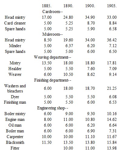 MONTHLY WAGES IN A COTTON MILL AT CAWNPORE FOR THE YEARS NAMED (IN RUPEES AND DECIMALS OF A RUPEE).