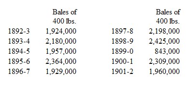Next to the United States, India is the largest cotton-producing country in the world, and, with the exception of Galveston and New Orleans, Bombay claims to be the largest cotton market. The shipments have never reached $50,000,000 a year, but have gone very near that point. Every large state in southern India produces cotton, but Bombay and Berar are the principal producers. The area for the whole of India in 1902-3 was 14,232,000 acres, but this has been often exceeded. In 1893-4 the area planted was nearly 15,500,000. The average is about 14,000,000 acres. Cotton is usually grown in conjunction with some other crop, and in certain portions of India two crops a year are produced on the same soil. The following table will show the number of bales produced during the years named: