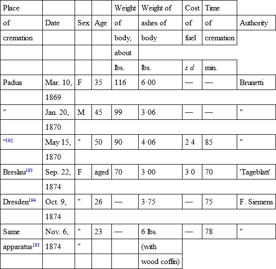 From these old-world practices – for they are old-world practices, although performed at the present day – we will now turn aside to examine into the modern and improved systems of cremation. The extracts which I shall make will be mostly from the work of Dr. De Pietra Santa.185 First of all come the experiments made by Dr. Polli at the gas works in Milan.