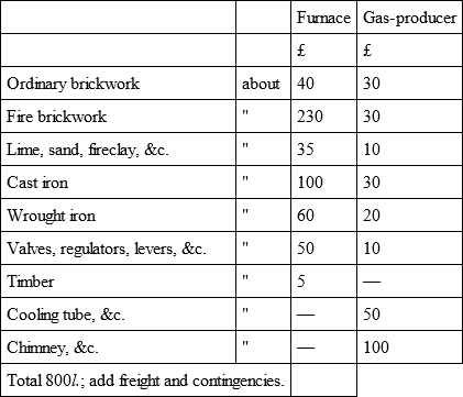 The minimum cost of a complete establishment for cremation upon the foregoing model, i.e., for the furnace and gas-producer as given in Plate II., but not including a mortuary building, would be as under: —