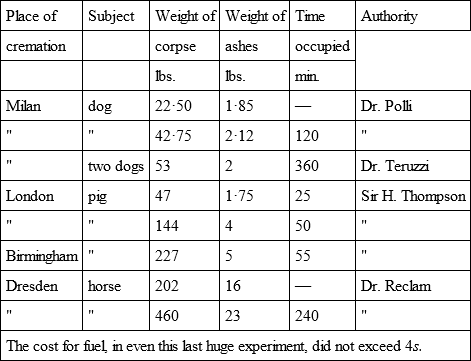 In case any reader would like to compare the above results with those derived from the cremation of the lower animals, I append the following recent instances variously treated.