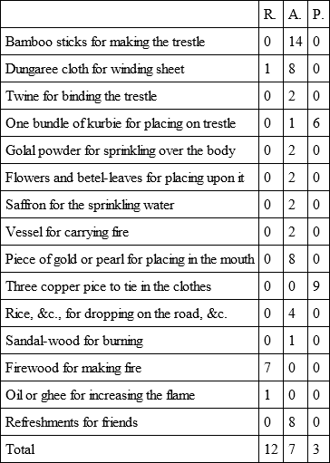 The cost of a Hindoo funeral of the humbler class in the neighbourhood of Poona, according to Col. Martin, is as follows: —