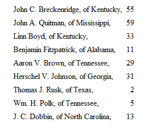 In looking over the proceedings of this coalition and combination of Bogus Democrats, Foreign Pauper Advocates, and anti-Protestant lovers of Religious Liberty, we have looked in vain for the names of distinguished Tennesseeans, who ought to have been second best, to say the least of it, in the ballots for a nomination! It was that Aaron V. Brown, "the son of a now sainted father," was put in nomination for the office of Vice President, by a Mr. Brown, supposed to be his nephew; but making no run at all, he was taken off the track instantly – rubbed down and salted away!