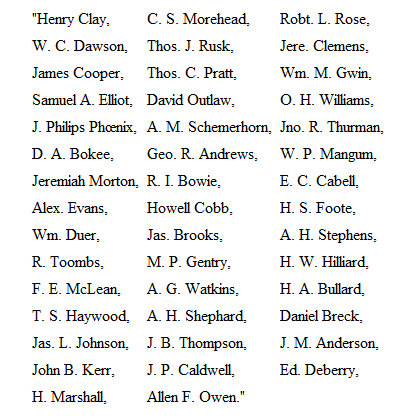 "The undersigned, members of the thirty-first Congress of the United States, believing that a renewal of sectional controversy upon the subject of slavery would be both dangerous to the Union and destructive of its objects; and seeing no mode by which such controversy can be avoided, except by a strict adherence to the settlement thereof effected by the Compromise Acts passed at the last session of Congress, do hereby declare their intention to maintain the said settlement inviolate, and to resist all attempts to repeal or alter the acts aforesaid, unless by the general consent of the friends of the measure, and to remedy such evils, if any, as time and experience may develop. And, for the purpose of making this resolution effective, they further declare that they will not support for the office of President, Vice-President, Senator, or Representative in Congress, or as a member of a State Legislature, any man, of whatever party, who is not known to be opposed to the disturbance of the settlement aforesaid, and to the renewal, in any form, of agitation upon the subject of slavery.