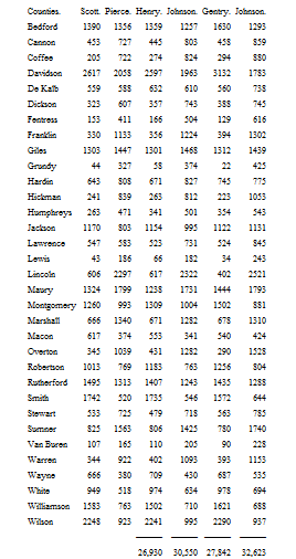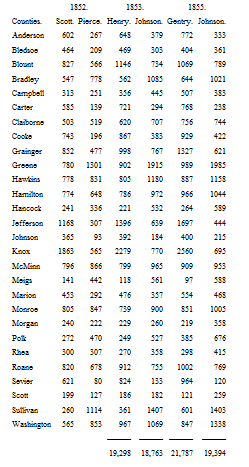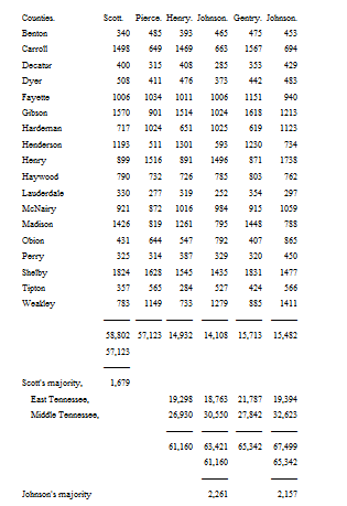 OFFICIAL VOTES OF THE STATEThe following tables exhibit the official vote of Tennessee for President in 1852, for Governor in 1853, and for Governor in 1855, as compared at the capital of the State, and will be valuable as a table for reference. In the last contest, when the Know Nothing issues were fully made, causing all the latent blackguardism in the Democratic ranks to be fully developed, it will be seen that Andrew Johnson received 67,499 votes, and Meredith P. Gentry 65,342, leaving Johnson a majority of 2,157, a falling off of 104 votes from his majority over Maj. Henry two years before that. It will also be perceived that the vote of the State at this last election is an increase of 8,260 over the vote two years previous. Of this increase, Col. Gentry gets 4,182, his vote exceeding Maj. Henry's by that much, while Johnson's increase upon his own vote two years previous was 4,078.