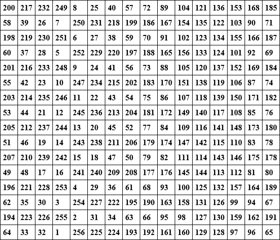 The square has the following properties: – Every straight row of sixteen numbers, whether vertical, horizontal, or diagonal, makes 2056.