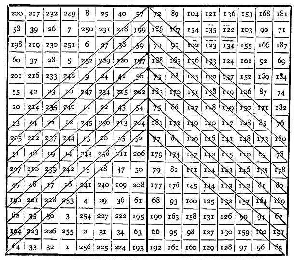 Before his election as member, Franklin had for several years held the appointment of Clerk to the Assembly, and he used to relieve the dulness of the debates by amusing himself in the construction of magic circles and squares, and "acquired such a knack at it" that he could "fill the cells of any magic square of reasonable size with a series of numbers as fast as" he "could write them." Many years afterwards Mr. Logan showed Franklin a French folio volume filled with magic squares, and afterwards a magic "square of 16," which Mr. Logan thought must have been a work of great labour, though it possessed only the common properties of making 2056 in every row, horizontal, vertical, and diagonal. During the evening Franklin made the square shown on the opposite page. "This I sent to our friend the next morning, who, after some days, sent it back in a letter, with these words: 'I return to thee thy astonishing and most stupendous piece of the magical square, in which – ;' but the compliment is too extravagant, and therefore, for his sake as well as my own, I ought not to repeat it. Nor is it necessary; for I make no question that you will readily allow this square of 16 to be the most magically magical of any magic square ever made by any magician."