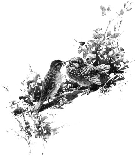 And yet, as I left the spot, I confess to a certain misgiving, as the pleading chirrup of the ousted fledgling followed me faintly and more faintly up the hill, recalling, too, the many previous similar acts of mine—and one in particular, when I had slaughtered in cold blood two of these irresponsibles found in a single nest. But sober second thought evoked a more philosophic and conscientious mood, the outcome of which leading, as always, to a semi-conviction that the complex question of reconciliation of duty and humanity in the premises was not thus easily disposed of, considering, as I was bound to do, the equal innocence of the chicks, both of which had been placed in the nest in obedience to a natural law, which in the case of the cow-bird was none the less a divine institution because I failed to understand it. Such is the inevitable, somewhat penitent conclusion which I always arrive at on the cow-bird question; and yet my next cow-bird fledgling will doubtless follow the fate of all its predecessors, the reminiscent qualms of conscience finding a ready philosophy equal to the emergency; for if, indeed, this parasite of the bird home be a factor in the divine plan of Nature's equilibrium, looking towards the survival of the fittest and the regulation of the sparrow and small-bird population, which we must admit, how am I to know but that this righteous impulse of the human animal is not equally a divine, as it is certainly a natural institution looking to the limitations of the cow-bird? One June morning, a year or two ago, I heard a loud squeaking, as of a young bird in the grass near my door, and, on approaching, discovered the spectacle of a cow-bird, almost full-fledged, being fed by its foster-mother, a chippy not more than half its size, and which was obliged to stand on tiptoe to cram the gullet of the parasite.