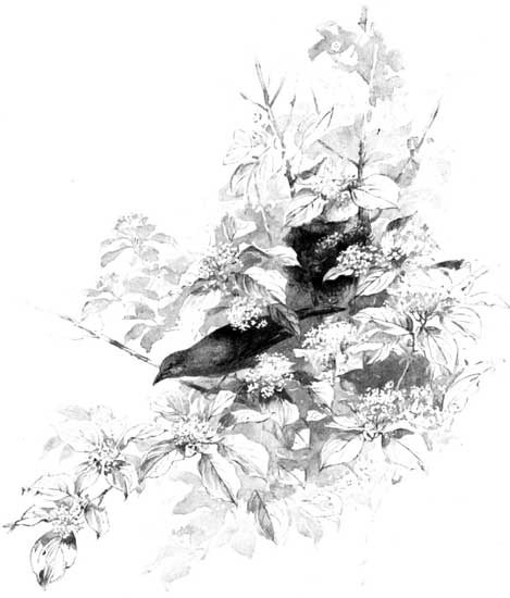 The egg is always laid betimes, and is usually the first to hatch, the period of incubation being a day or two less than that of the eggs of the foster-parent. And woe be to the fledglings whom fate has associated with a young cow-bird! He is the "early bird that gets the worm." His is the clamoring red mouth which takes the provender of the entire family. It is all "grist into his mill," and everything he eats seems to go to appetite—his bedfellows, if not thus starved to death, being at length crushed by his comparatively ponderous bulk, or ejected from the nest to die. It is a pretty well established fact that the cuckoo of Europe deliberately ousts its companion fledglings—a fact first noted by the famous Dr. Jenner. And Darwin has even asserted that the process of anatomical evolution has especially equipped the young cuckoo for such an accomplishment—a practice in which some accommodating philosophic minds detect the act of "divine beneficence," in that "the young cuckoo is thus insured sufficient food, and that its foster-brothers thus perish before they have acquired much feeling."