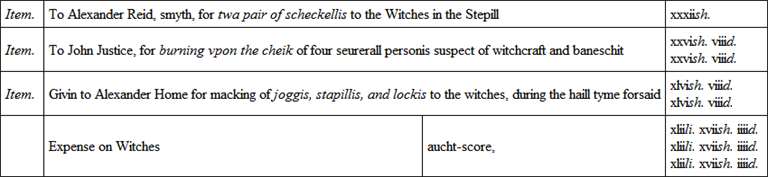 Among the victims committed to the flames in 1596-97, we read the names of ‘Katherine Fergus and [Sculdr], Issobel Richie, Margaret Og, Helene Rodger, Elspet Hendersoun, Katherine Gerard, Christin Reid, Jenet Grant, Helene Frasser, Katherine Ferrers, Helene Gray, Agnes Vobster, Jonat Douglas, Agnes Smelie, Katherine Alshensur, and ane other witche, callit …’ – seventeen in all. That during their imprisonment they were treated with barbarous rigour, may be inferred from the following entries: