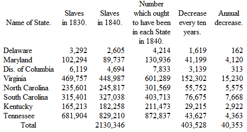 The census of 1840, therefore, exhibits an annual unnatural decrease of over forty thousand of the slave-population in the exporting States. But this census, at least so far as statistics touching slaves and free colored persons are concerned, is notoriously and grossly incorrect. Either it or the tables prepared from it in the State Department have been dishonestly prepared, or very much garbled, apparently with the intent to prove that slavery was better calculated to secure the health of the negro race than a state of freedom. What figures will tell in favor of slavery? – not, what figures will tell the truth? – seems to have been the principle on which the last census was taken. Such being the case, we feel confident that the census makes the slaves in the exporting States decrease as little as possible. In 1830, Virginia had 469,757 slaves. In 1840 she ought to have had this number, and their natural increase for ten years, 135,532. Instead of this, all the natural increase is gone, and 20,770 besides! All will see that such a statement would tell too strongly against slavery to be admitted into a census got up under such slave-supporting auspices, unless the statement was really within the truth.